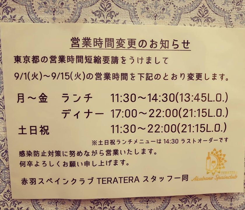 テラテラは引き続き時短営業します!なるべく早めのご来店お願いします✨